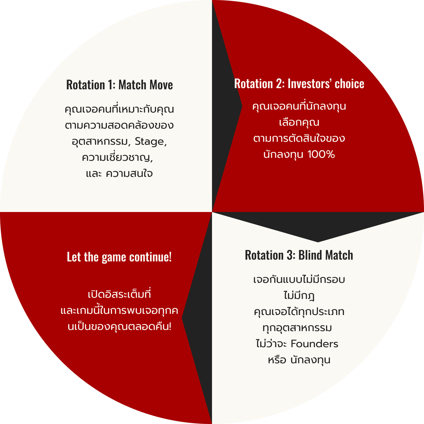 คุณจะได้เวียนโต๊ะไปพบกับนักลงทุนหลายท่าน เจอนักลงทุนที่แตกต่างเพื่อ Direction ที่ชัดพร้อมคำแนะนำที่แม่นยำ